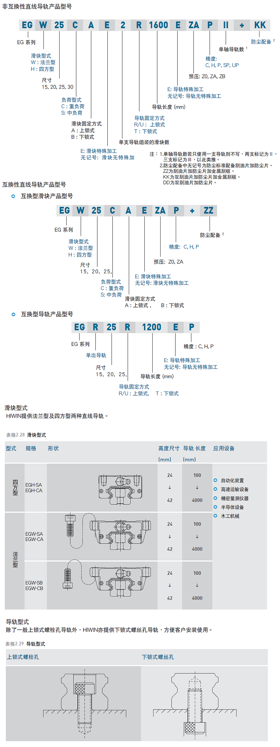 EG系列使用四列鋼珠承受負荷設計,使其具備高剛性、高負荷的特性,同時具備四方向等負載特色、及自動調心的功能, 可吸收安裝面的裝配誤差,得到高精度的訴求。 加上降低組合高度及縮短滑塊長度,非常適合高速自動化產業機械及空間要求的小型設備使用。