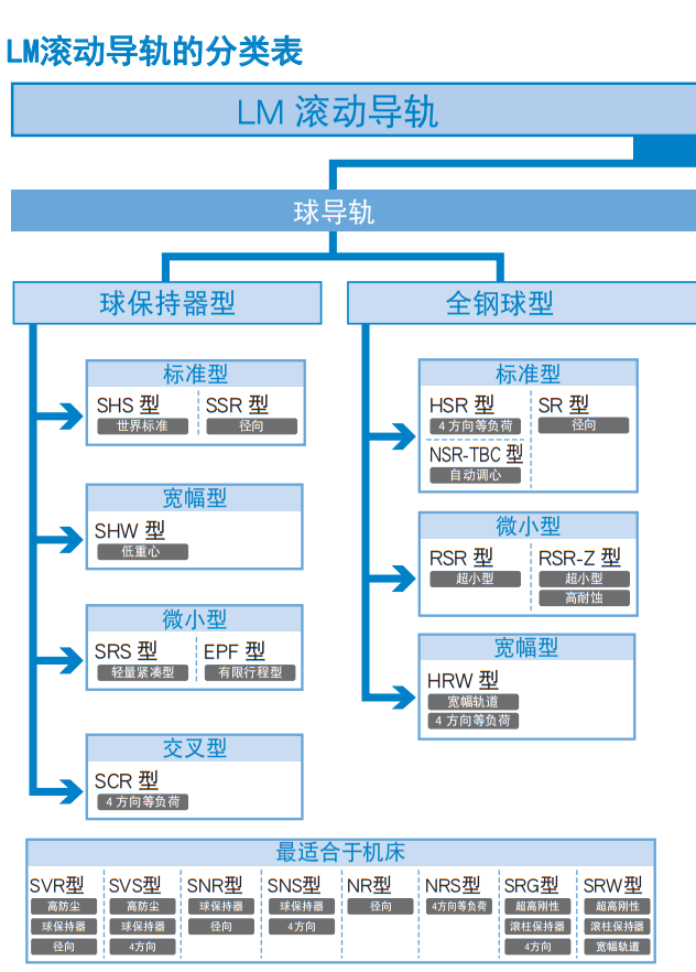LM滾動導軌(全鋼球型) 從小型導軌到機床用的大型導軌,從直線導軌到弧形導軌,一系列型號適合各種用途。